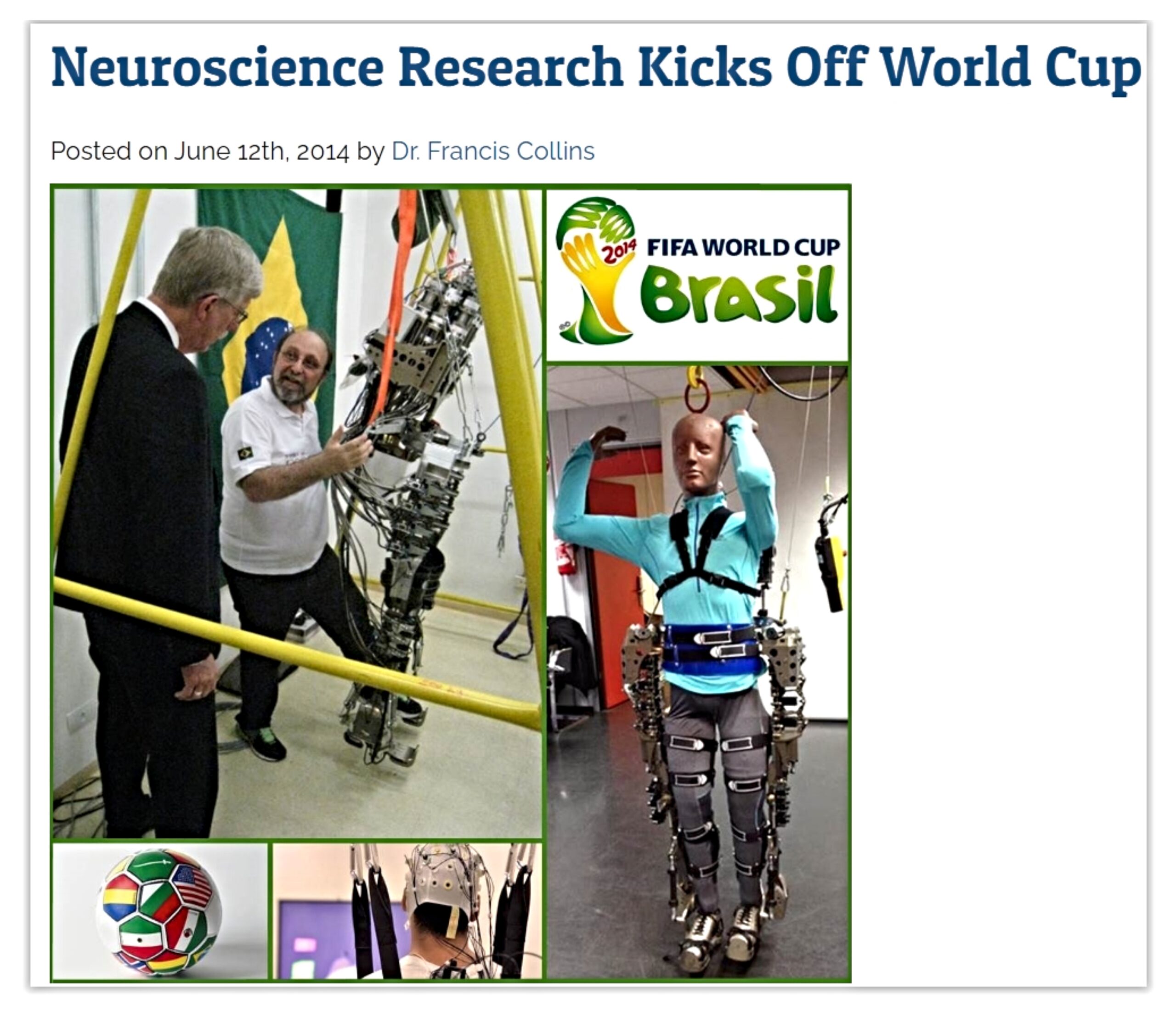 Mais de um bilhão de pessoas em todo o mundo pode ver hoje pela primeira vez em ação a pesquisa de vanguarda em neurociência, quando um jovem paraplégico, vestindo um exoesqueleto robótico controlado pelo pensamento, chutou uma bola para o lançamento do Copa Mundial Fifa 2014, na cerimônia de abertura em São Paulo – Brasil.