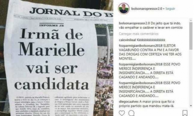 Em um post em que publicou uma matéria que anunciava a intenção da irmã de Marielle de se lançar na política, a legenda dizia: “Do jeito que tá indo, vão empalhar o cadáver e levar em comício”.