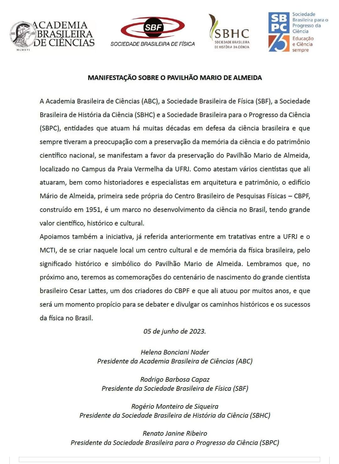 Em nota, a Academia Brasileira de Ciências (ABC), a Sociedade Brasileira de Física (SBF), a Sociedade Brasileira de História da Ciência (SBHC) e a Sociedade Brasileira para o Progresso da Ciência (SBPC) defendem a preservação do Pavilhão Mário de Almeida.