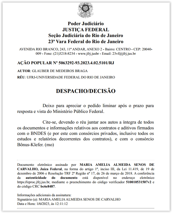 — Determinou à UFRJ juntar todos os documentos e informações solicitados.