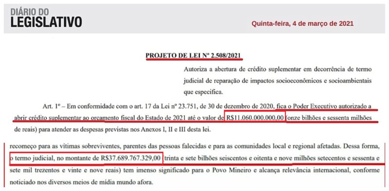 Após a assinatura do acordo, no ano passado, foi encaminhado para a Assembleia Legislativa de Minas Gerais o Projeto de Lei 2.508/2021, requerendo a abertura de crédito adicional somente com relação ao montante de RS 11.060.000.000,00 (onze bilhões e sessenta milhões de reais) no orçamento fiscal do Estado de 2021. O valor representa pouco mais de 30% (trinta por cento) do valor total do acordo.