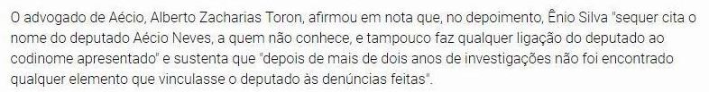 Segundo a grande imprensa, o advogado de Aécio Neves disse que Ênio Augusto Pereira e Silva não teria citado o deputado em seu depoimento à PF (veja abaixo):