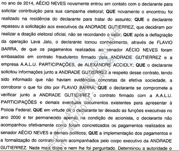 Quase ao final do depoimento, Sérgio Andrade diz que soube através de Flávio Barra que os pagamentos feitos a Aécio foram  realizados por meio de contrato fraudulento firmado pela Andrade Gutierrez e a empresa A.A. L.U. Participações, do empresário carioca Alexandre Accioly.