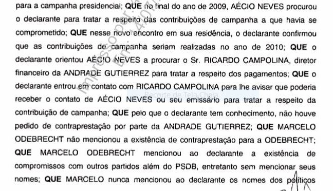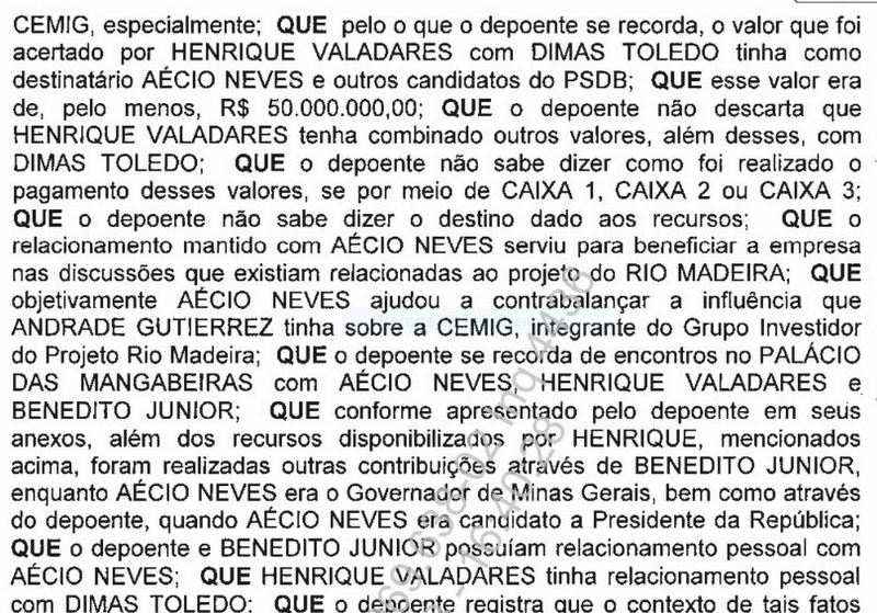 Essas delações indicavam que Aécio Neves teria recebido R$ 50 milhões (2009 e 2010) para atuar em favor dos interesses dos grupos Odebrecht e Andrade Gutierrez na Cemig (Companhia Energética de Minas Gerais) e em Furnas (Furnas Centrais Elétricas).