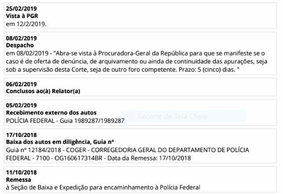 Só em 6 de fevereiro de 2019, ela foi conclusa ao ministro Fachin, como mostra a movimentação do inquérito no STF.