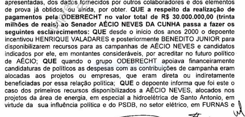 Detalhando. Em delação premiada, Marcelo Odebrecht, então presidente da Odebrecht, e Henrique Valladares, na época presidente da Odebrecht Infraestrutura, informaram que a empreiteira havia pago R$ 30 milhões para que Aécio influenciasse a favor do projeto Rio Madeira (Usinas Hidrelétricas de Santo Antônio e Jirau, em Rondônia).