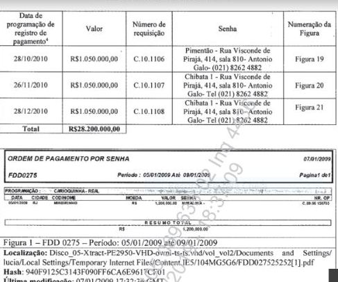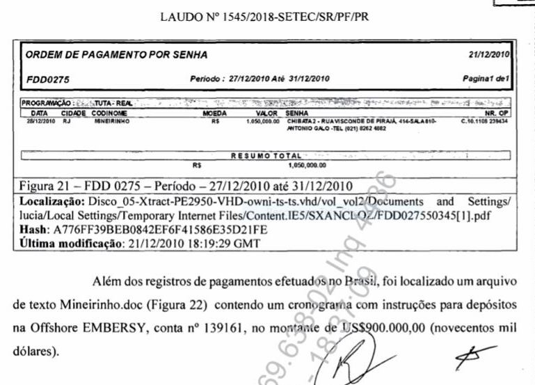 A perícia da PF comprova o repasse (entre janeiro de 2009 e dezembro de 2010) de R$ 28,2 milhões para Mineirinho.