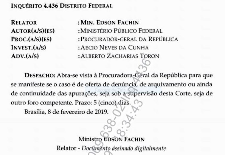 Dois dias depois, em 8 de fevereiro de 2019, o ministro Fachin despachou para procuradora-Geral da República, Raquel Dodge: