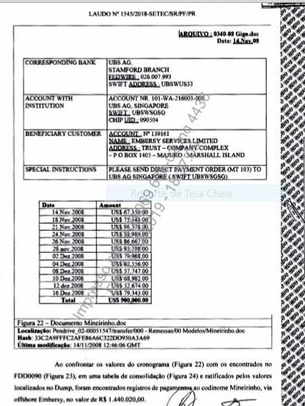 Comprova também o depósito (novembro e dezembro de 2008) de US$ 900 mil na conta da Offshore Embersy Services Limited, para Mineirinho.