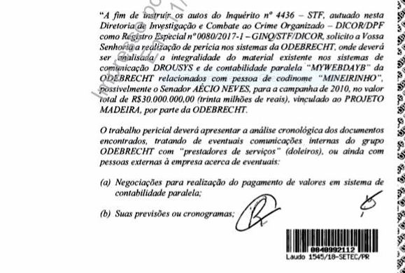 A solicitação de perícia, recebida pela PF em 28 de maio de 2018, foi feita pelo ministro Edson Fachin, relator da Lava Jato no Supremo Tribunal Federal (STF) e do inquérito 4.436, que investiga o agora deputado federal Aécio Neves (PSDB-MG).