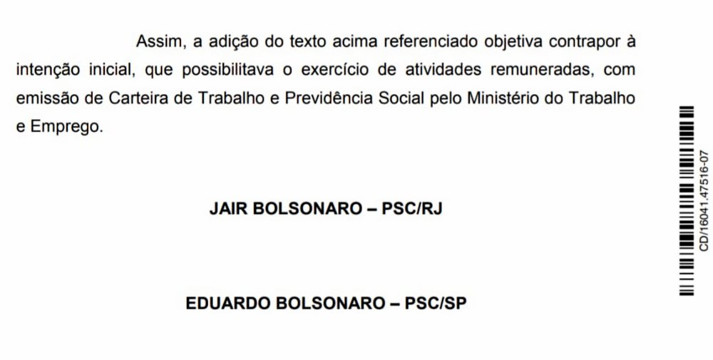 No texto da emenda, Jair e Eduardo Bolsonaro dizem discordar do programa “em sua totalidade”.