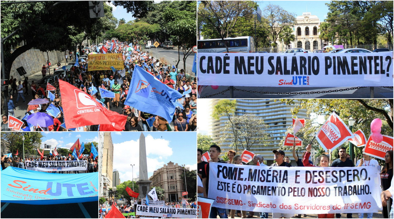 Trabalhadores e trabalhadoras da educação e da saúde sob a coordenação do Sindicato Único dos Trabalhadores em Educação de Minas Gerais (Sind-UTE/MG), Sisipsemg e Sind-Saúde realizaram hoje (16/5/18) um ato unificado em frente ao Palácio da Liberdade para cobrar do governador Fernando Pimentel o pagamento dos salários no 5º dia útil de cada mês e repudiar a atitude do governo de adiar para a próxima sexta-feira (18) o pagamento da primeira parcela dos salários.