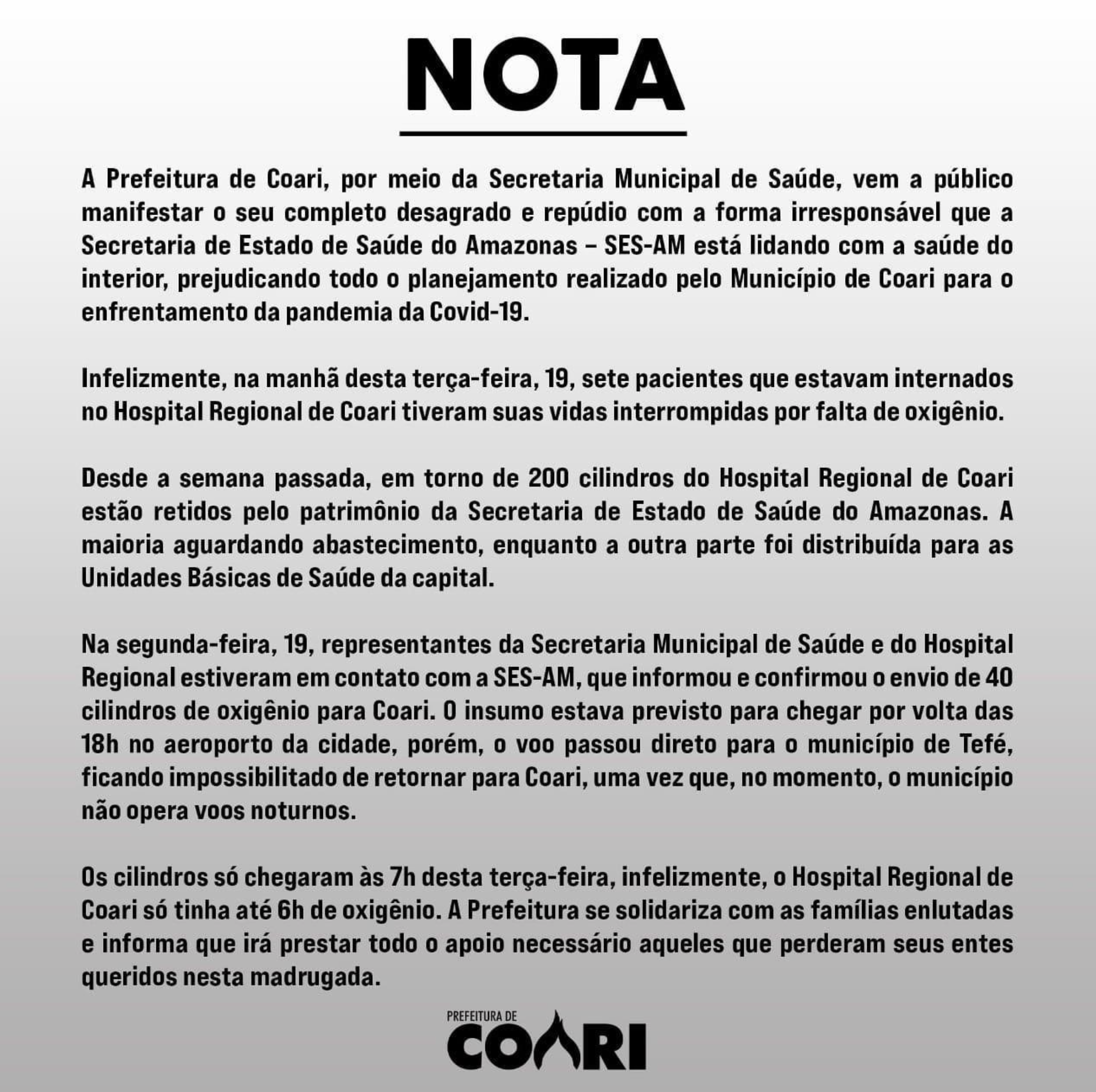A Prefeitura Municipal de Coari, uma cidade de 60 mil habitantes às margens do Solimões, no Amazonas, confirmou que 7 pessoas que estavam intubadas no Hospital Regional morreram hoje cedo por falta de oxigênio.