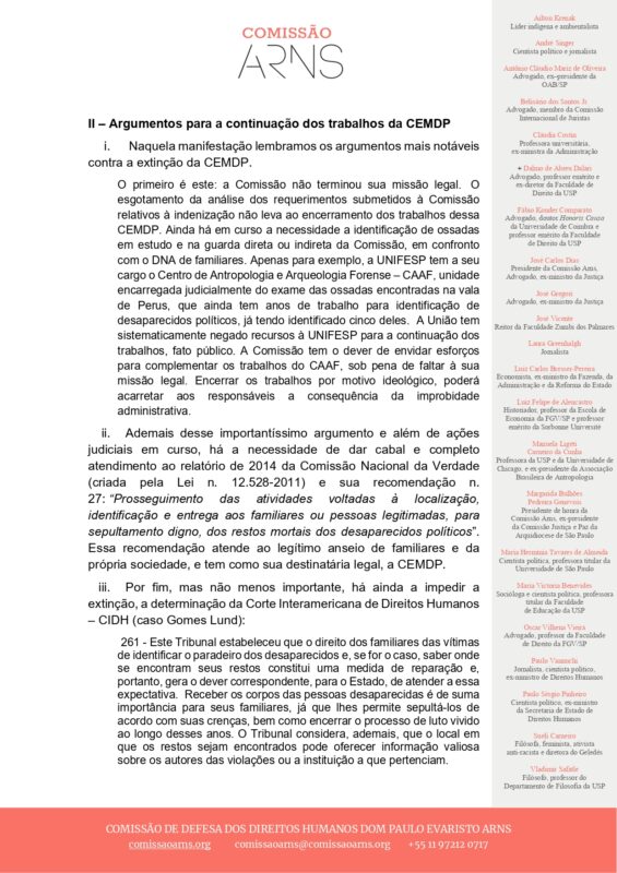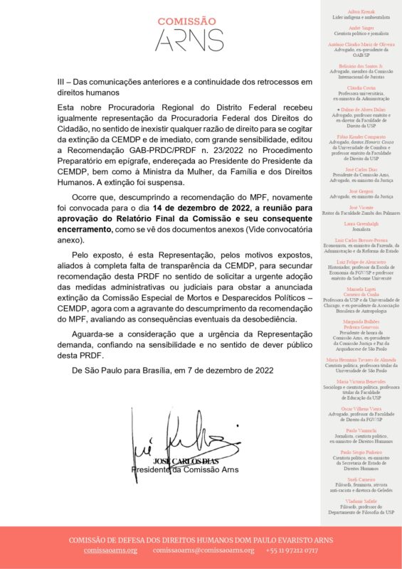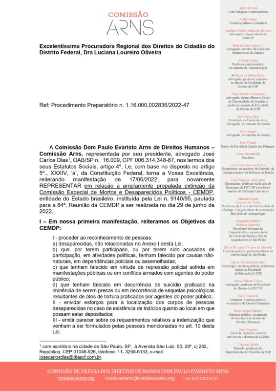 Em junho deste ano, a Comissão Arns encaminhou uma representação à Procuradora Regional dos Direitos do Cidadão do Distrito Federal, Luciana Loureiro Oliveira, defendendo a continuidade do relevante trabalho da CEMDP, que já estava sob ameaça ilegal de extinção.