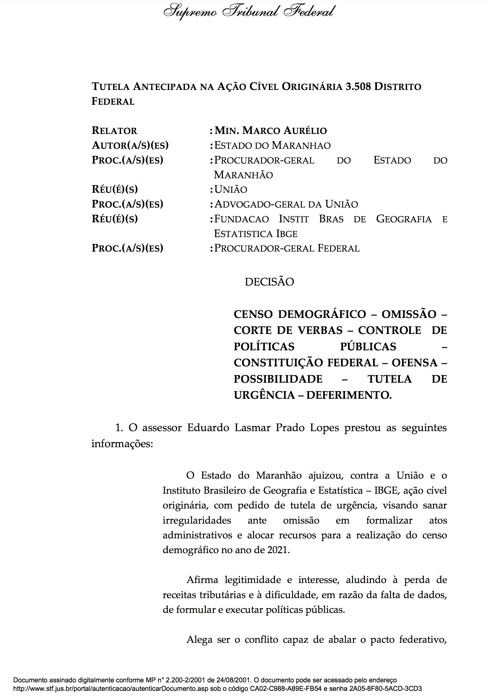 O ministro Marco Aurélio, do STF, em decisão monocrática, decidiu obrigar o governo Bolsonaro a fazer o Censo 2021, atendendo a pedido do estado do Maranhão.