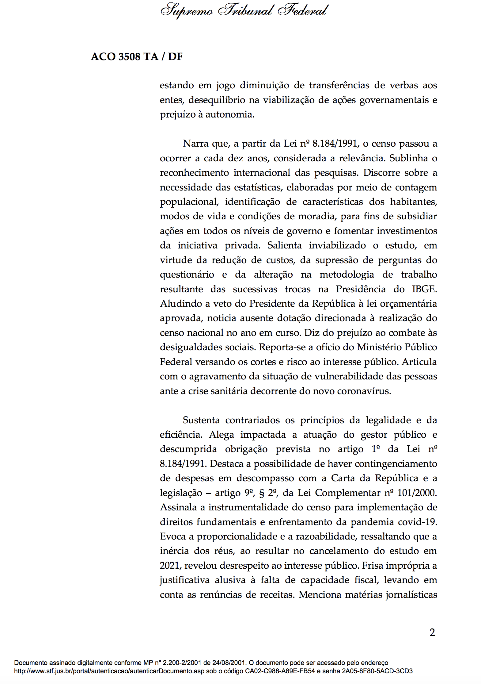 A liminar determina a adoção de medidas voltadas à realização do censo, observados os parâmetros preconizados pelo IBGE, no âmbito da sua discricionariedade técnica.