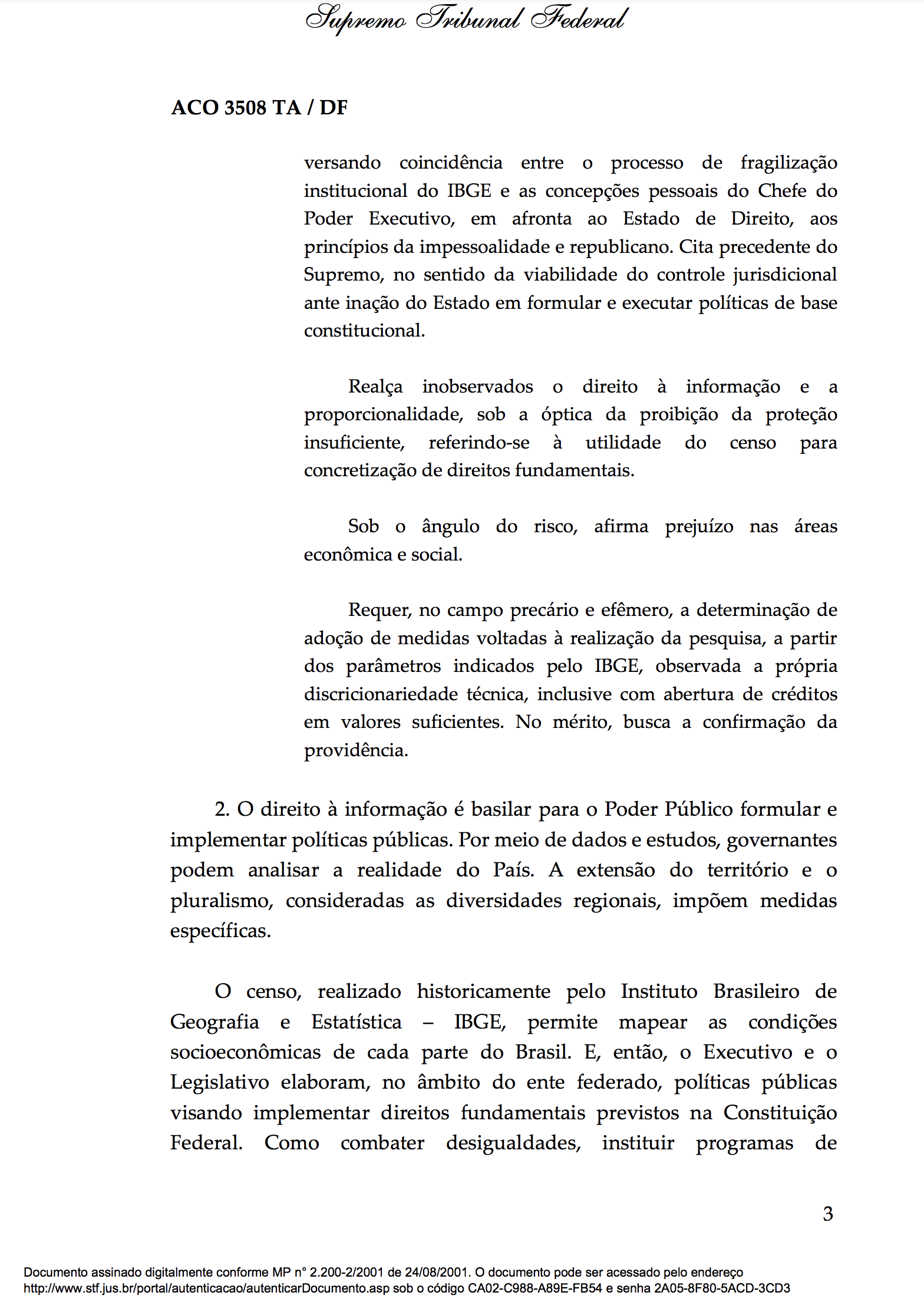 Sustenta, ainda, que a não realização do censo causa desequilíbrio na viabilização de ações governamentais, em razão da dificuldade na formulação e na execução de políticas públicas, com prejuízo à autonomia dos entes federativos.