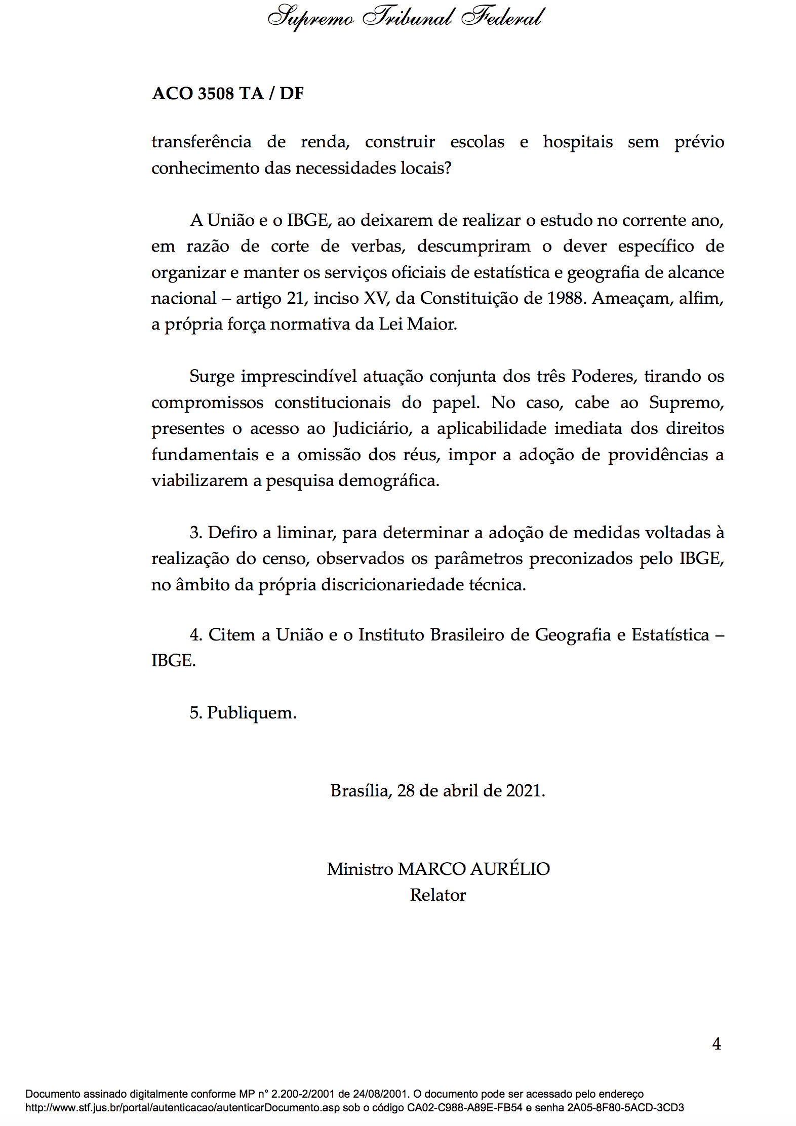O ministro Marco Aurélio, do Supremo Tribunal Federal (STF), deferiu liminar para determinar à União e à Fundação Instituto Brasileiro de Geografia e Estatística (IBGE) a adoção de medidas voltadas à realização do censo demográfico de 2021.