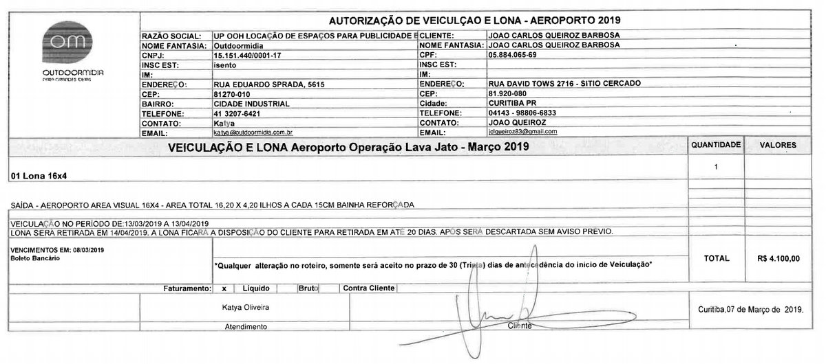 O procurador Diogo Castor de Mattos pagou pelo outodoor em homenagem à Lava Jato, exibido em Curitiba (PR), e a empresa Outdoormídia, responsável pela peça publicitária, recebeu pelo serviço.