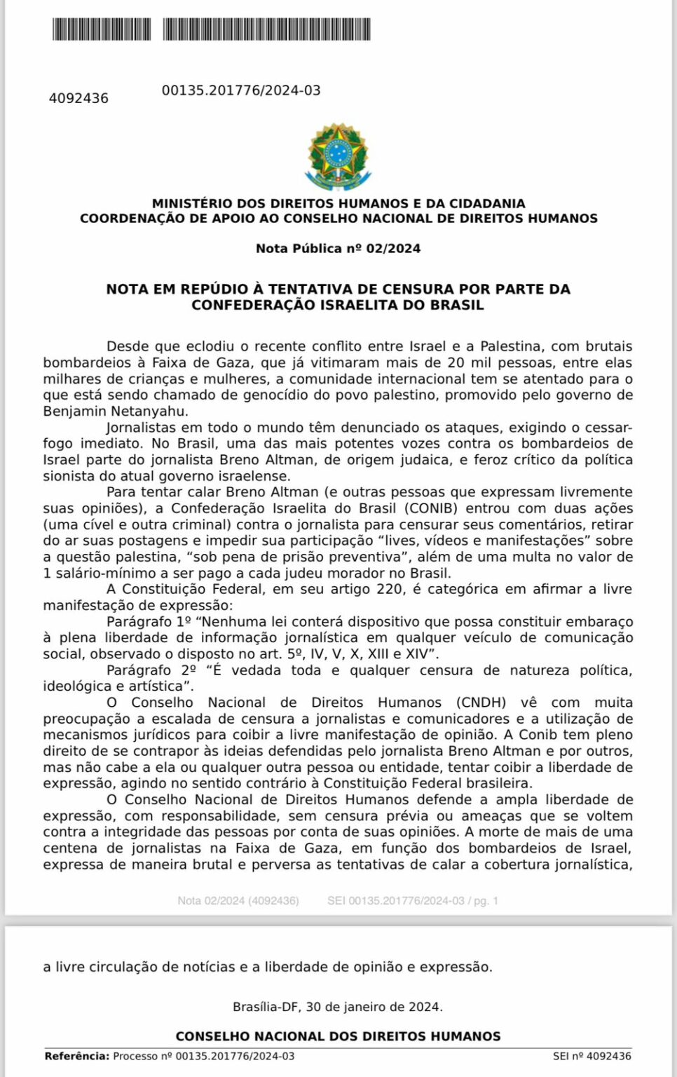 O Conselho Nacional de Direitos Humanos (CNDH) expressou, em documento intitulado “Nota em repúdio à tentativa de censura por parte da Confederação Israelita do Brasil”, condenação ao que descreveu como “tentativa de censura” contra o jornalista Breno Altman.