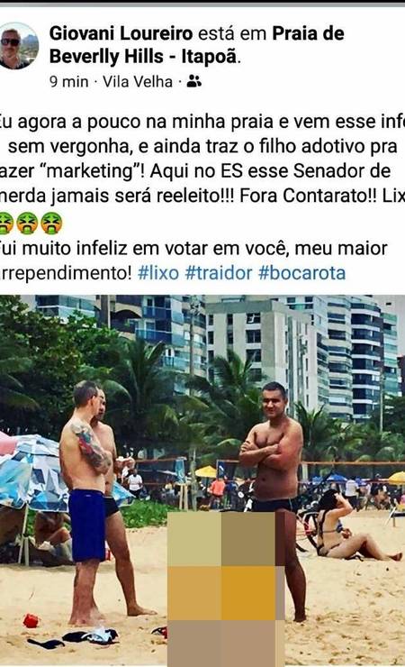 “Eu agora a pouco [sic] na minha praia e vem esse infeliz ” [sic] sem vergonha, e ainda traz o filho adotivo pra fazer ‘marketing’! Aqui no ES esse Senador de merda jamais será reeleito!!! Fora Contarato!! Lixo”, escreveu Loureiro no post. “Fui muito infeliz em votar em você, meu maior arrependimento”