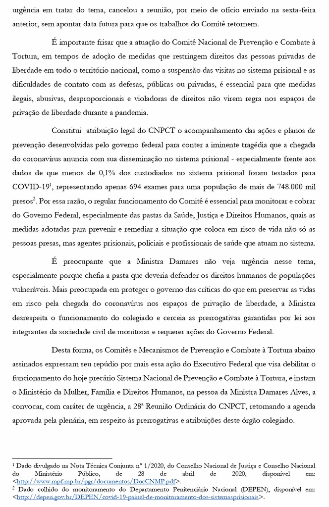 Damares alega não ser urgente tratar de covid-19 nas prisões e cancela reunião; comitês de combate à tortura denunciam