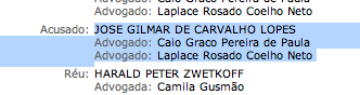Porém, maior surpresa eu tive quando percebi que todos os denunciados, exceto Eliane Beraldo, são representados pelos mesmos advogados (Caio Graco Pereira de Paula e Laplace Rosado Coelho Neto) – apesar de alguns terem outros representantes além dos dois (caso de João Faustino, que também tem Alexandre de Morais como advogado – aquele na conta de quem João depositou R$ 20 mil e que foi o supersecretário de Kassab, responsável inclusive pela área de inspeção veicular).