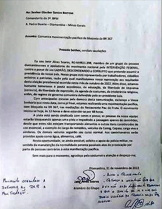 Ele encaminhou ofício (veja imagem abaixo) ao comandante do 3º Batalhão da Polícia Militar de Minas Gerais, solicitando apoio da PM para o bloqueio da BR 367, na cidade de Diamantina.