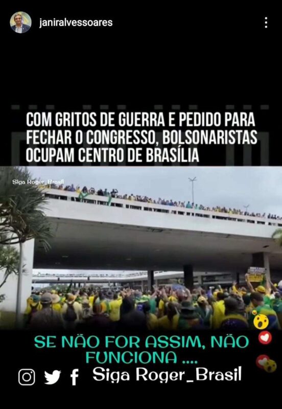 Nesse domingo, 08/01, logo após vândalos destruírem o Palácio do Planalto, Supremo Tribunal Federal (STF) e Congresso Nacional, ele postou em rede social (@janiralvessoares) o vídeo acima, elogiando as ações criminosas e golpistas.