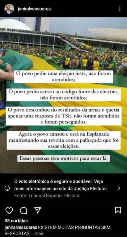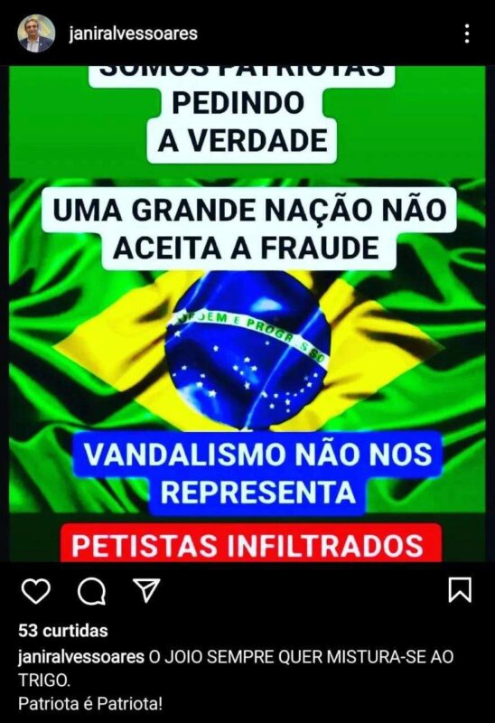 Janir Alves postou também nas redes sociais as artes abaixo, nas quais exalta as ações, justifica-as e atribui o vandalismo a “petistas infiltrados”.