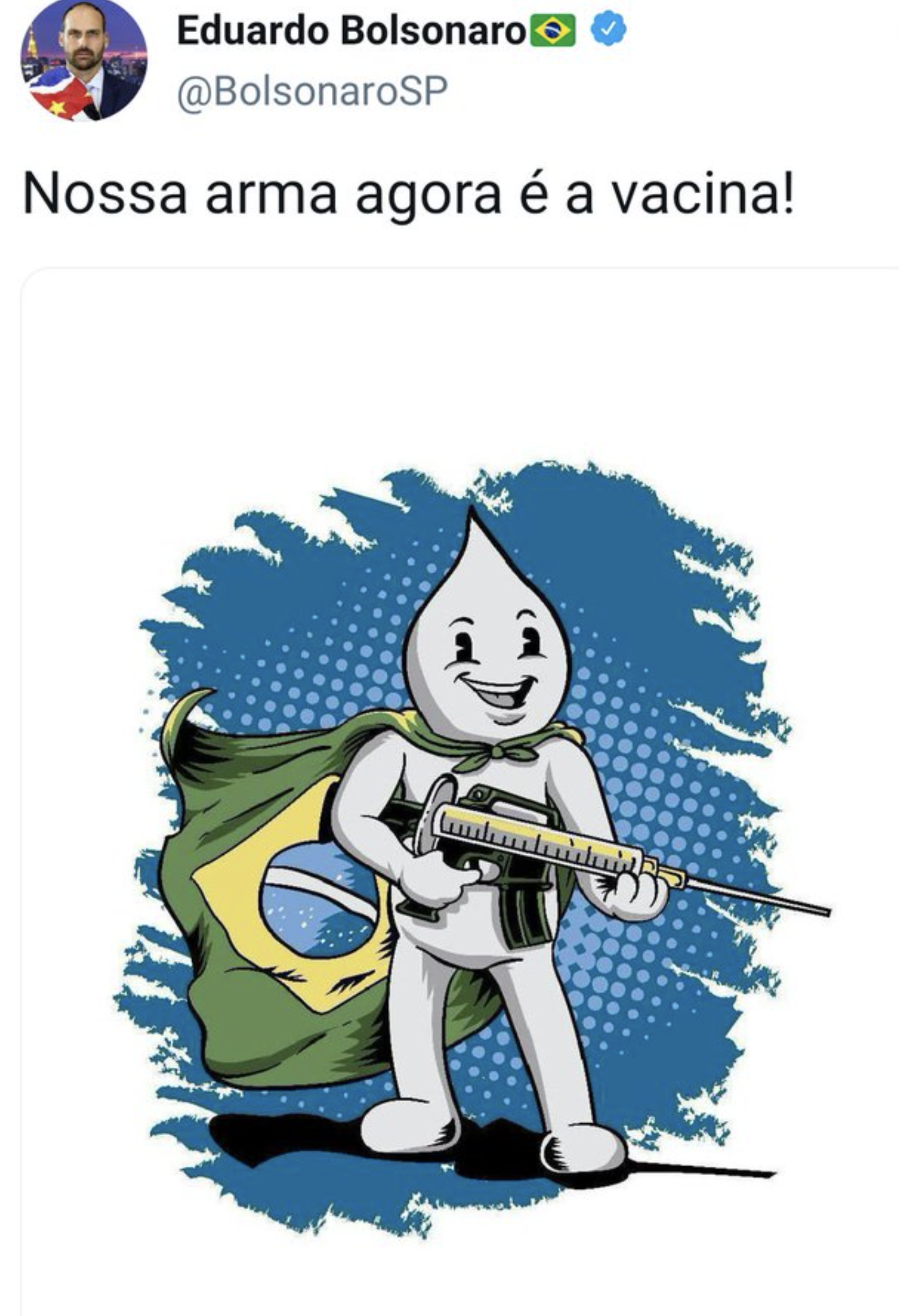 Agora, em resposta a Lula, o deputado federal Eduardo Bolsonaro, filho do presidente da República, transformou o Zé Gotinha em miliciano: colocou uma metralhadora na mão dele.