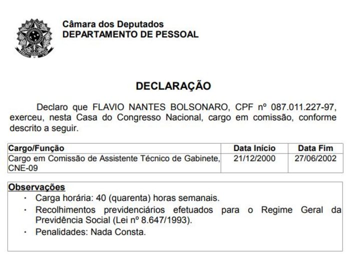 Flávio Bolsonaro ocupou o posto de assistente técnico de gabinete de dezembro de 2000 a junho de 2002, quando saiu a pedido.