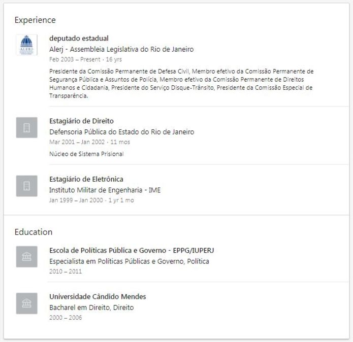 Currículo de Flávio Bolsonaro em seu perfil no LinkedIn