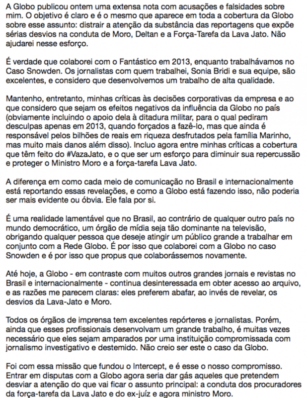 Greenwald rebate Globo: Objetivo da emissora é desviar atenção de conteúdo que compromete Moro e Dallagnol