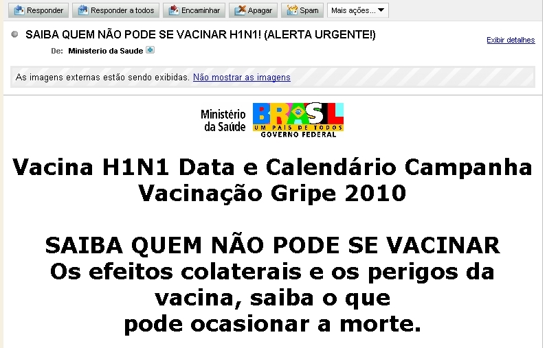 O alvo da vez é a vacina contra a influenza H1N1, influenza pandêmica, nova gripe, ou gripe suína, como é mais conhecida. Desde março, e-mails amedrontadores espalham-se: vacina assassina, genocídio programado pela Organização Mundial de Saúde e indústria farmacêutica, contém células de câncer de animal que pode provocar câncer nas pessoas, entre outros apelos.