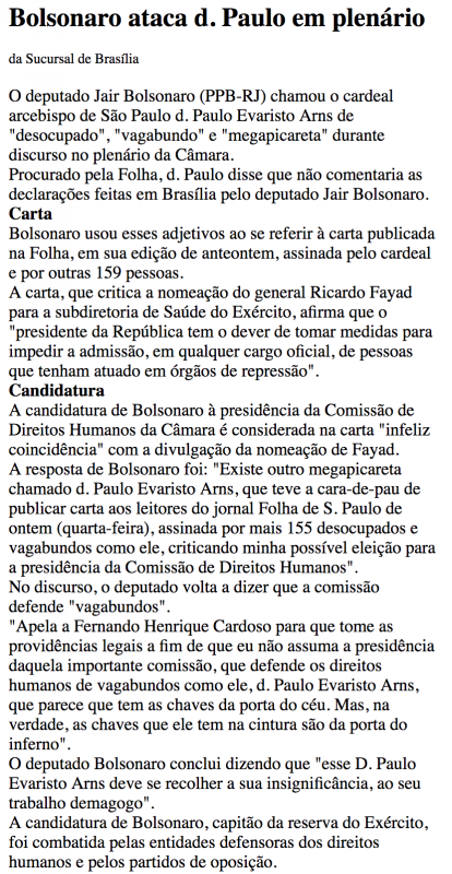 Haddad deu como exemplo os ataques do candidato neofascista a Dom Paulo Evaristo Arns, a quem Bolsonaro acusou na Câmara Federal, em discurso, de ser “vagabundo” e “megapicareta”.