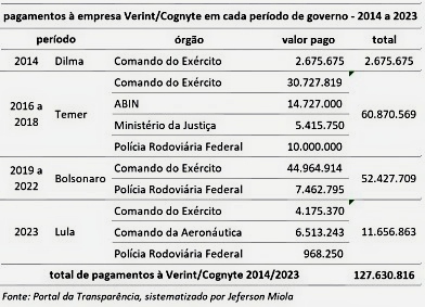 4. Desde o primeiro registro de pagamento à Verint/Cognyte no Portal da Transparência, em 2014, o governo pagou pelo menos R$ 127,6 milhões ao grupo. Os valores se referem à compra de software, equipamentos e tecnologias de vigilância, monitoramento, espionagem e contratos de manutenção, treinamentos e serviços correlatos.