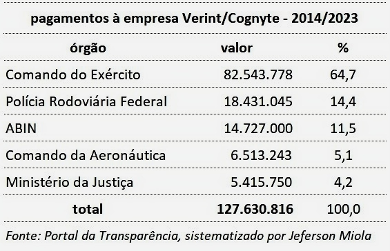 Do total de R$ 127,6 milhões, a ABIN foi responsável por contratar apenas R$ 14,7 milhões da Cognyte, ou 11,5% do total.