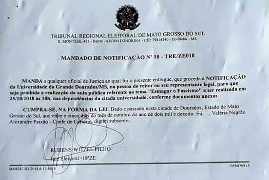 Na Universidade Federal da Grande Dourados, em Dourados (MS), o TRE confimou que, com um mandado judicial, interrompeu aula sobre fascismo. O evento era uma palestra organizada pelo DCE.