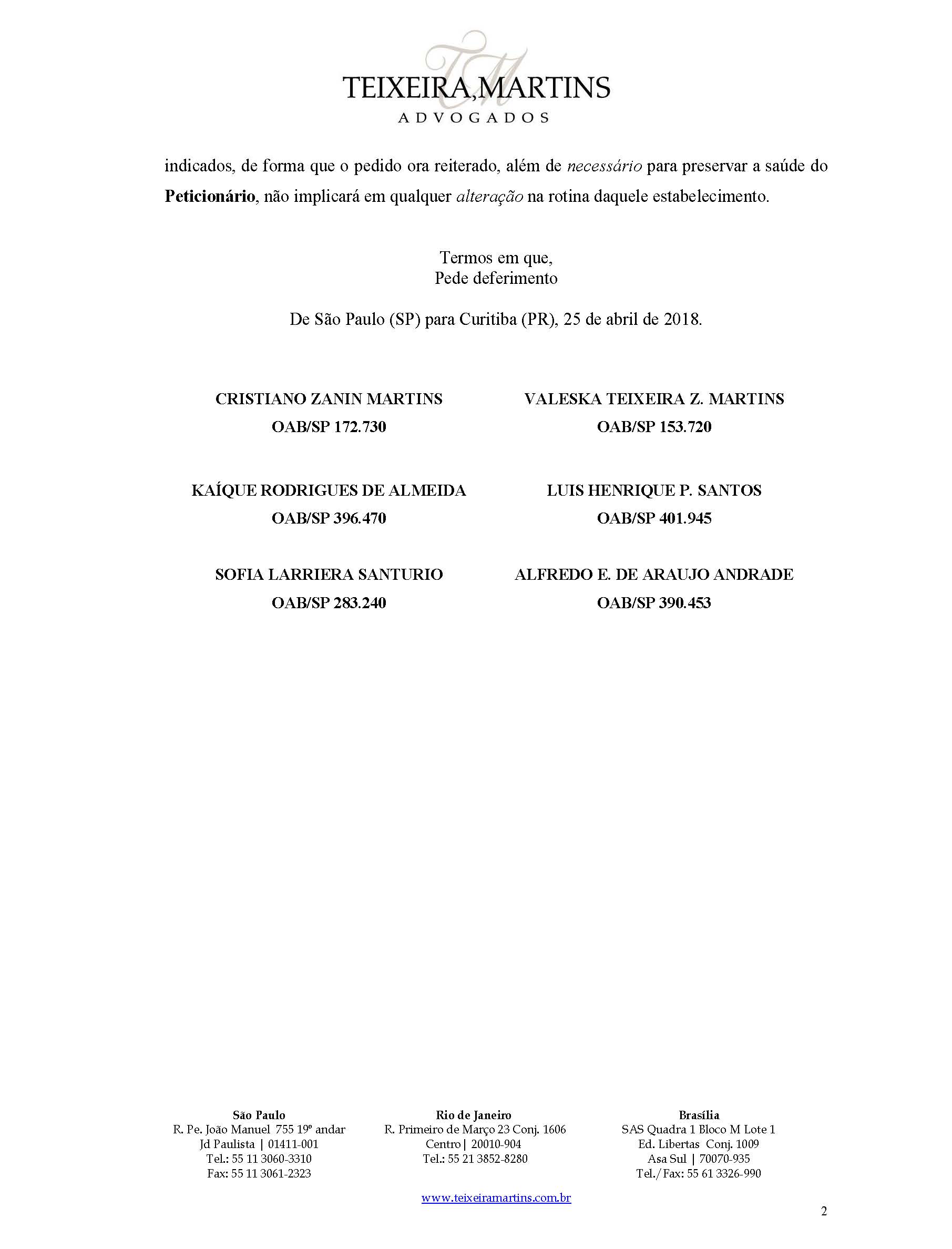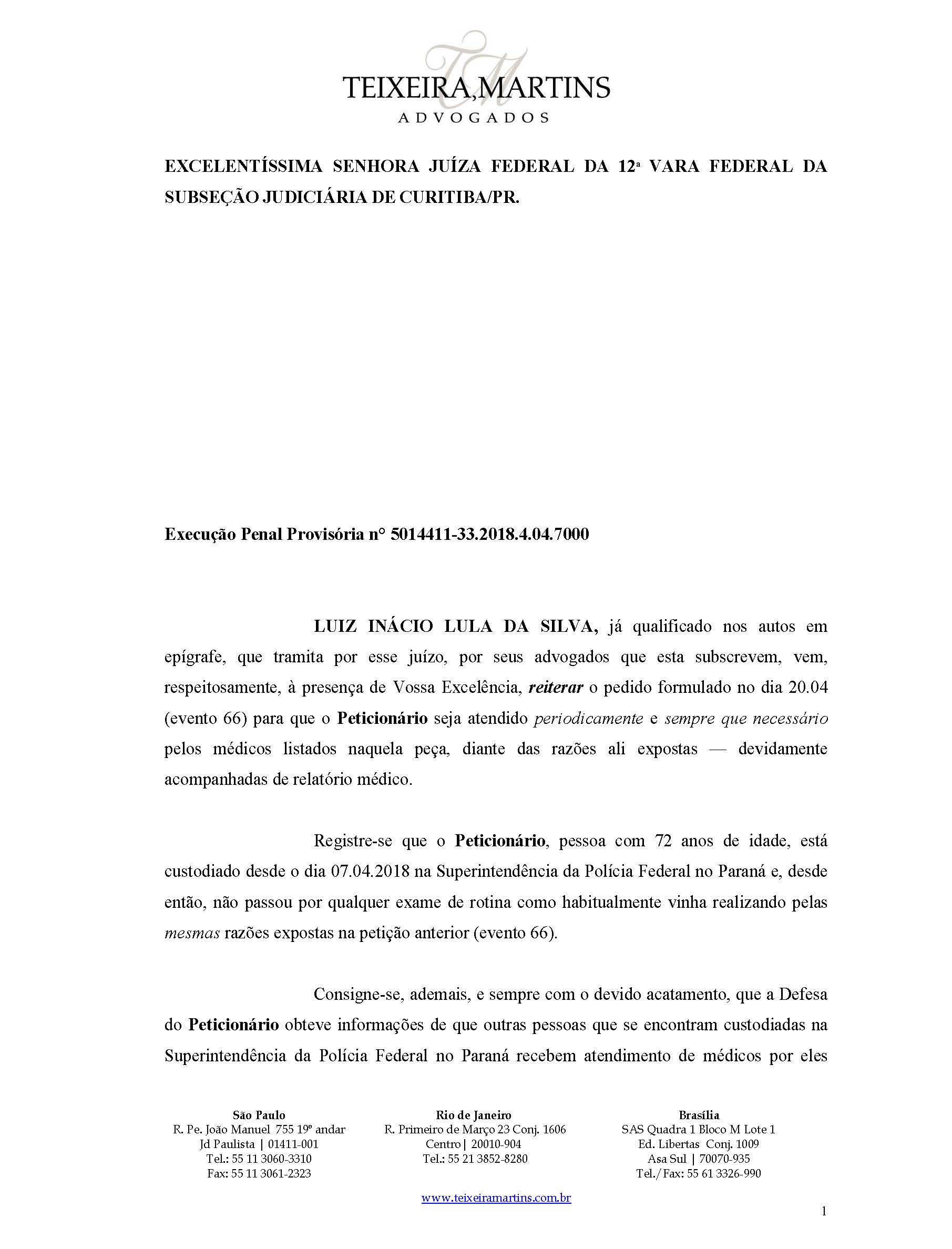 Por isso, hoje a defesa protocolou um novo pedido (veja abaixo) , reiterando à juíza o feito em 20 de abril, para que ela autorize Lula a ser atendido periodicamente e sempre que necessário pelos médicos já indicados.