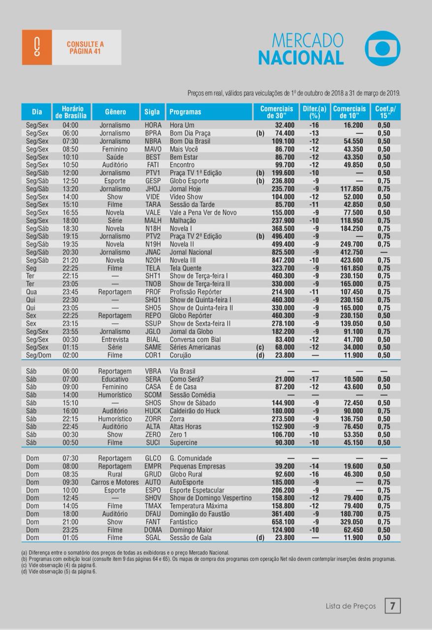 Praça TV 1 Edição( segunda a sábado) — 3 anúncios diários, 6 dias da semana, ao custo de R$ 399.200,00 cada anúncio.