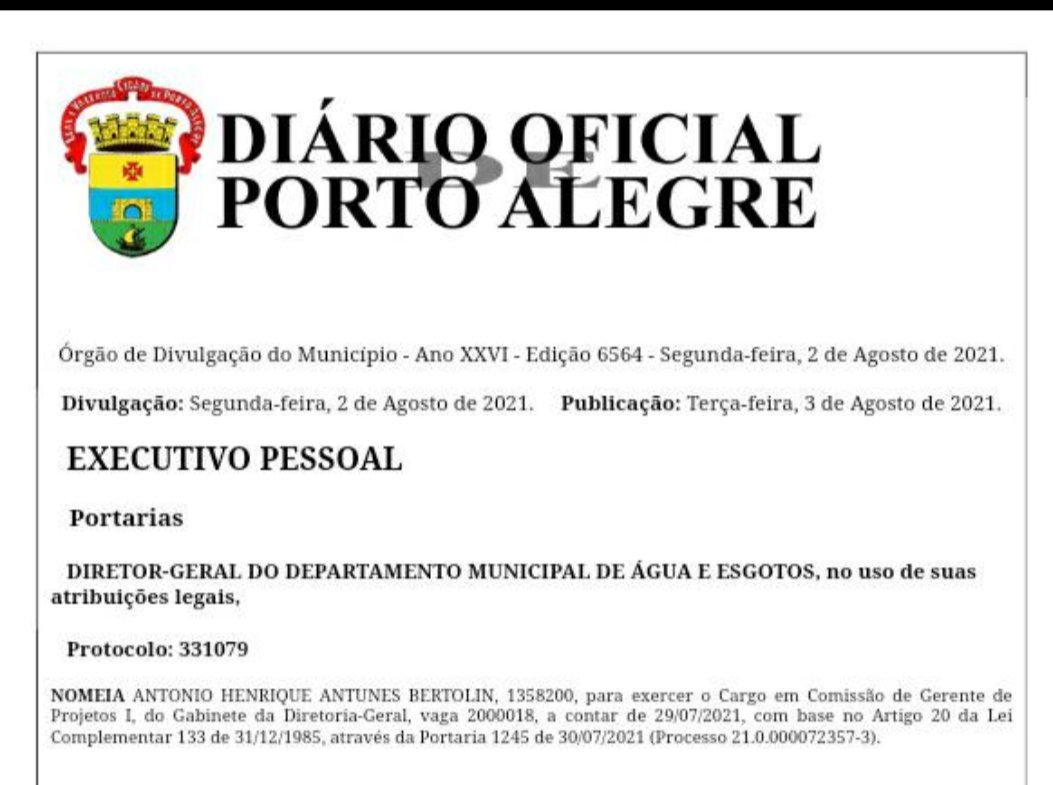 “Antonio Henrique Antunes Bertolin é cargo de confiança do prefeito Sebastião Melo (MDB)”.