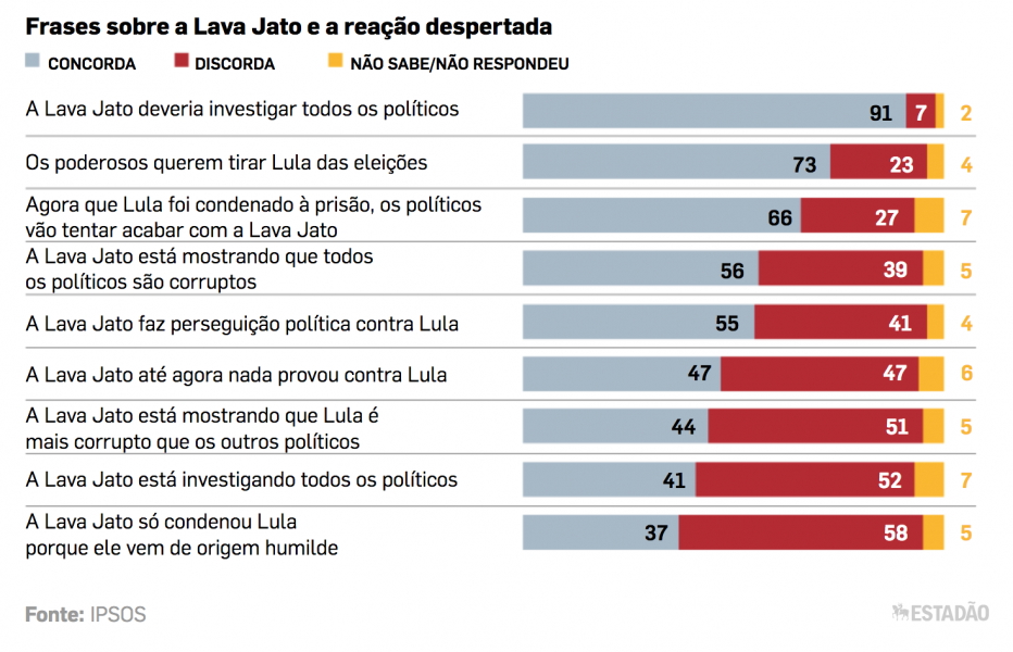 Mesmo com 69% dos entrevistados dizendo que o ex-presidente tem alguma participação em algum esquema investigado pela Lava Jato — uma pergunta um tanto quanto ampla e, portanto, indutiva — 73% consideram que “os poderosos” querem tirar Lula das eleições de 2018.