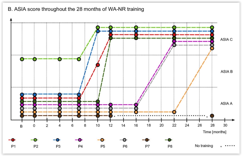 Os sete pacientes que permaneceram no estudo por 28 meses (gráfico ao lado) mudaram de paraplégicos completos para paraplégicos parciais.