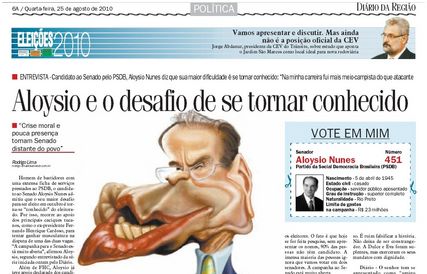 No mesmo jornal Diário da Região, em 25 de agosto passado, aparece a matéria Aloysio e o desafio de se tornar conhecido, cuja imagem grandiosa – pedindo votos ao seu genuíno latifundiário filho da terra – pode ser vista abaixo: