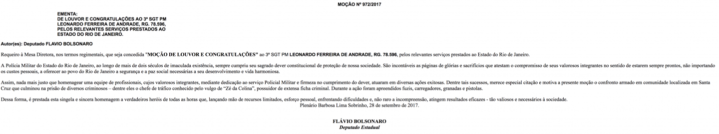 A Polícia Militar do Estado do Rio de Janeiro, ao longo de mais de dois séculos de imaculada existência, sempre cumpriu seu sagrado dever constitucional de proteção de nossa sociedade. (…) Dentre tais sucessos, merece especial citação e motiva a presente moção o confronto armado em comunidade localizada em Santa Cruz que culminou na prisão de diversos criminosos – dentre eles o chefe de tráfico conhecido pelo vulgo de “Zé da Colina”, possuidor de extensa ficha criminal.