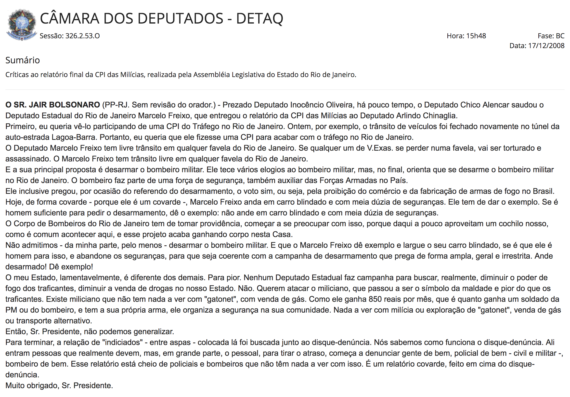 No dia 17/12/2008, outro discurso defendendo os milicianos das críticas de Marcelo Freixo, do Psol, marcado para morrer.