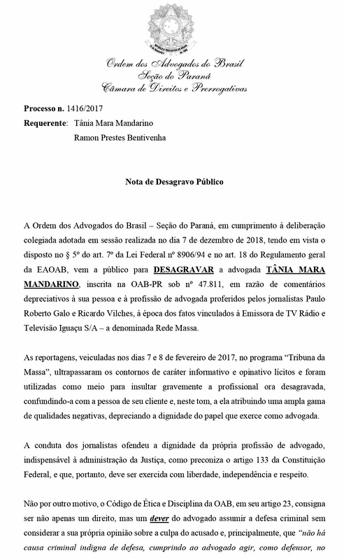 Em 7 e 8 de fevereiro de 2017, os advogados Ramon Bentivenha e Tânia Mandarino foram alvo de ataques caluniosos e injuriosos por partes dos jornalistas Paulo Roberto Galo e Ricardo Vilches (foto abaixo), que apresentavam um programa sensacionalista na chamada Rede Massa de Televisão, retransmissora do SBT no Paraná.
