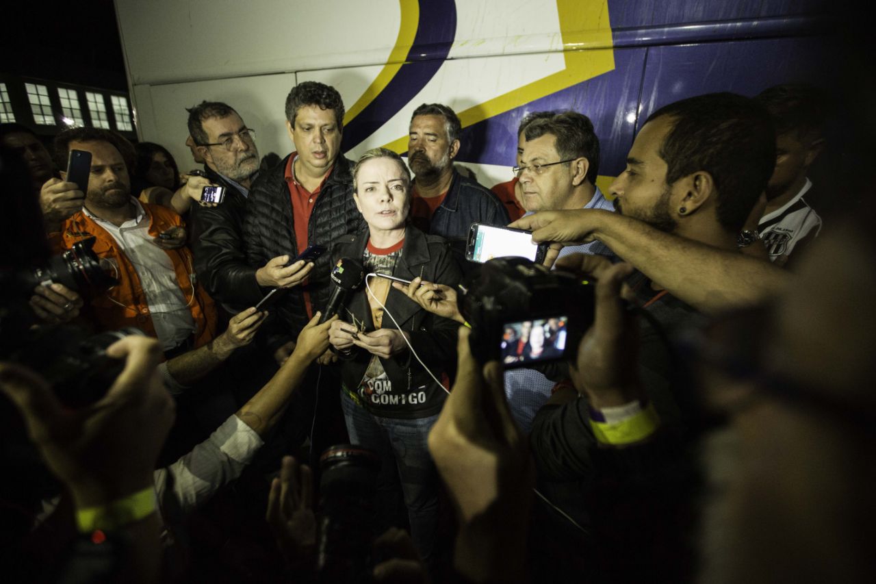 O atentado contra a caravana de Lula no Paraná ocorreu entre Quedas do Iguaçu e Laranjeiras. A foto de Joka Madruga registra a coletiva de imprensa que a presidenta do PT, senadora Gleisi Hoffmann, deu assim que o grupo chegou a Laranjeiras, após os ônibus serem atingidos por quatro tiros
