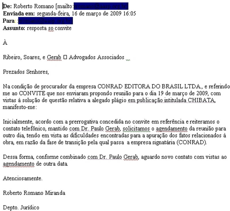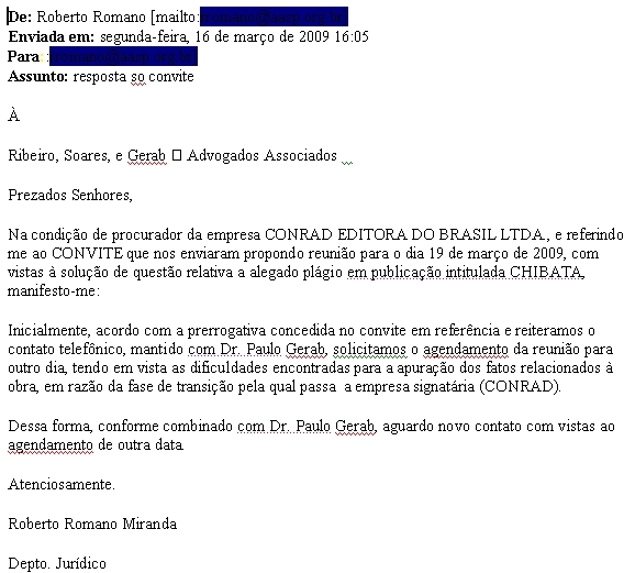 Eu enviei uma carta à Conrad convidando para uma reunião a fim de tratar de solução amigável ao plágio. Tivemos algumas marcações e cancelamentos por parte da editora, alegando seu procurador que a empresa estava em mudança de adminstração e encontrava dificuldades para agendar o encontro. Depois de alguns telefonemas veio a resposta por e-mail [abaixo]. Não chegamos a apresentar proposta para eventual acordo porque não se realizou reunião alguma. Como seguiam os adiamentos pela Conrad e não agendavam o encontro, passado bom tempo, por ética antes me descompromissei com seu procurador e depois demos entrada à ação.